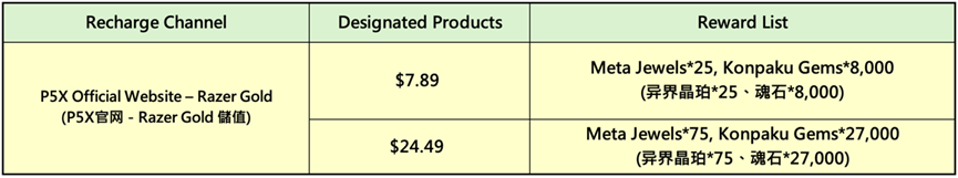 活动期间内,前往 P5X游戏官网 透過Razer渠道购买指定面额产品,并成功充值至《Persona5: The Phantom X》游戏中,即可获得相应虚宝奖励回馈。