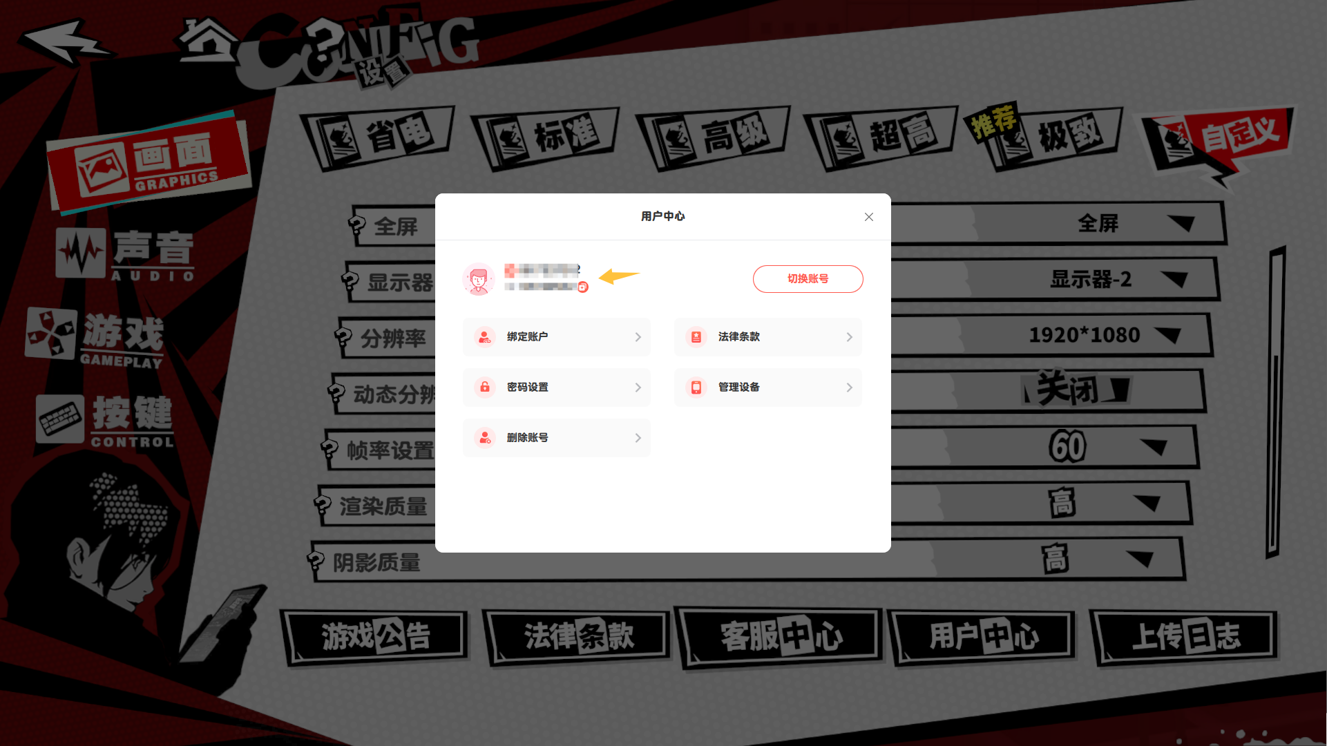 1. 点击游戏主画面选单→设置→用户中心